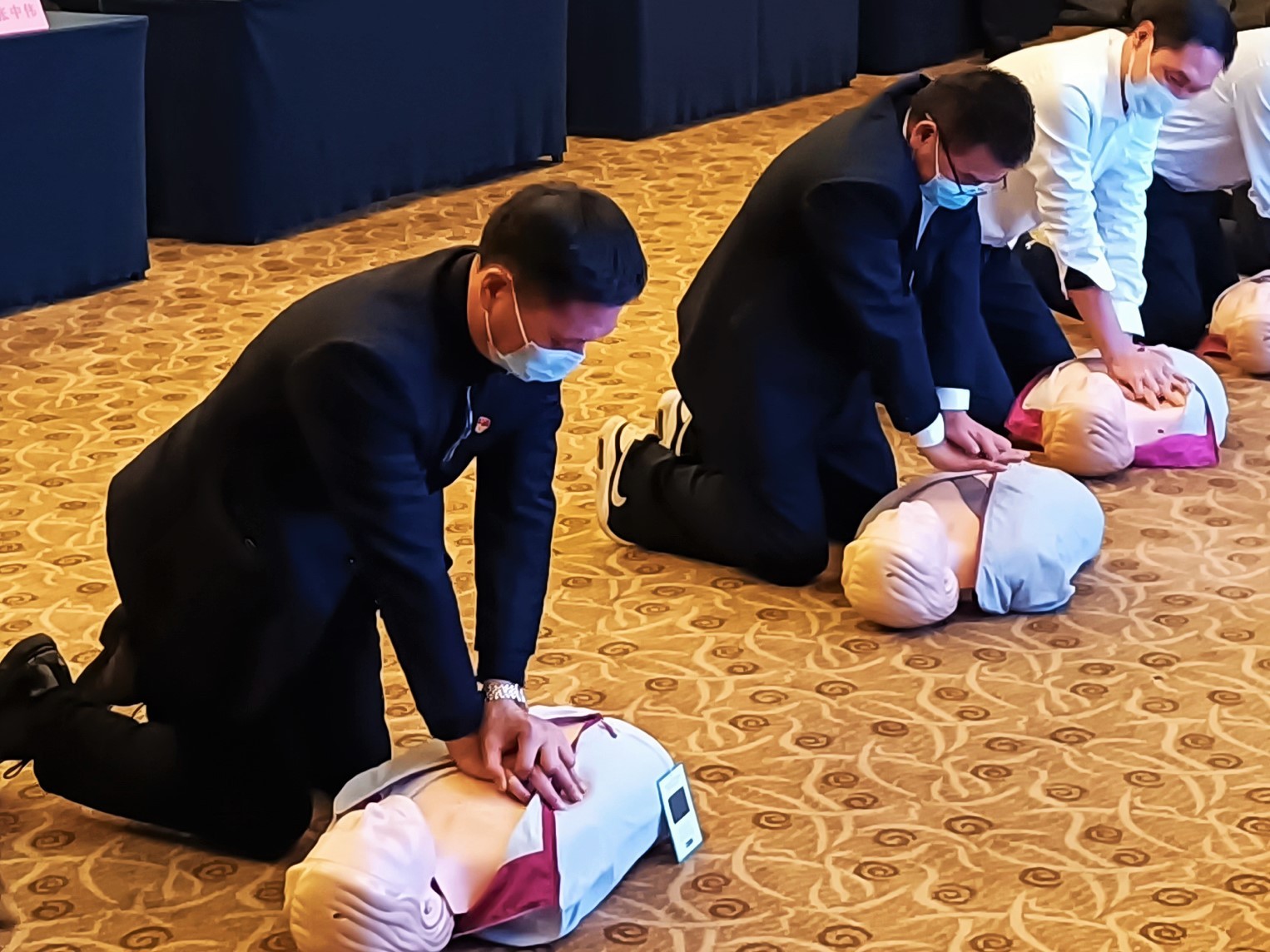 學以致用,鞏固認知。通過培訓講師的引導,在場員工順利實現應急救護理論與技能實操的聯動。強運動量的力竭、十指緊扣的脹痛絲毫未能阻擋全員積極參與心肺復蘇術實操。跟隨節拍器的按壓節奏,從伊始的“眼神聚焦位置錯誤”、“手臂發力部位不當”、“未使人體模具腹部有效隆起”到滿分學員大量涌現,實踐熱情度不斷高漲,技能掌握度顯著提升,為“危難時刻,我有準備”奠基。
