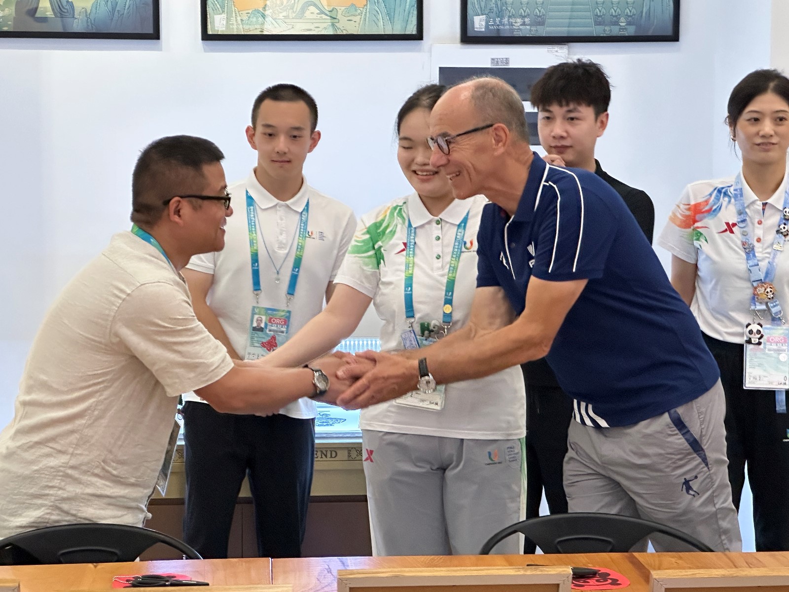 莊叢燦的剪影作品和其耐心負(fù)責(zé)的剪紙教學(xué)倍受運(yùn)動(dòng)員們“點(diǎn)贊好評”的同時(shí),也吸引了國際大體聯(lián)和各國代表團(tuán)人員前來“沉浸式體驗(yàn)”。期間,莊叢燦為國際大體聯(lián)代理主席雷諾·艾德和意大利代表團(tuán)官員彼得羅·伊瓦爾迪進(jìn)行剪紙教學(xué)和剪影留念。