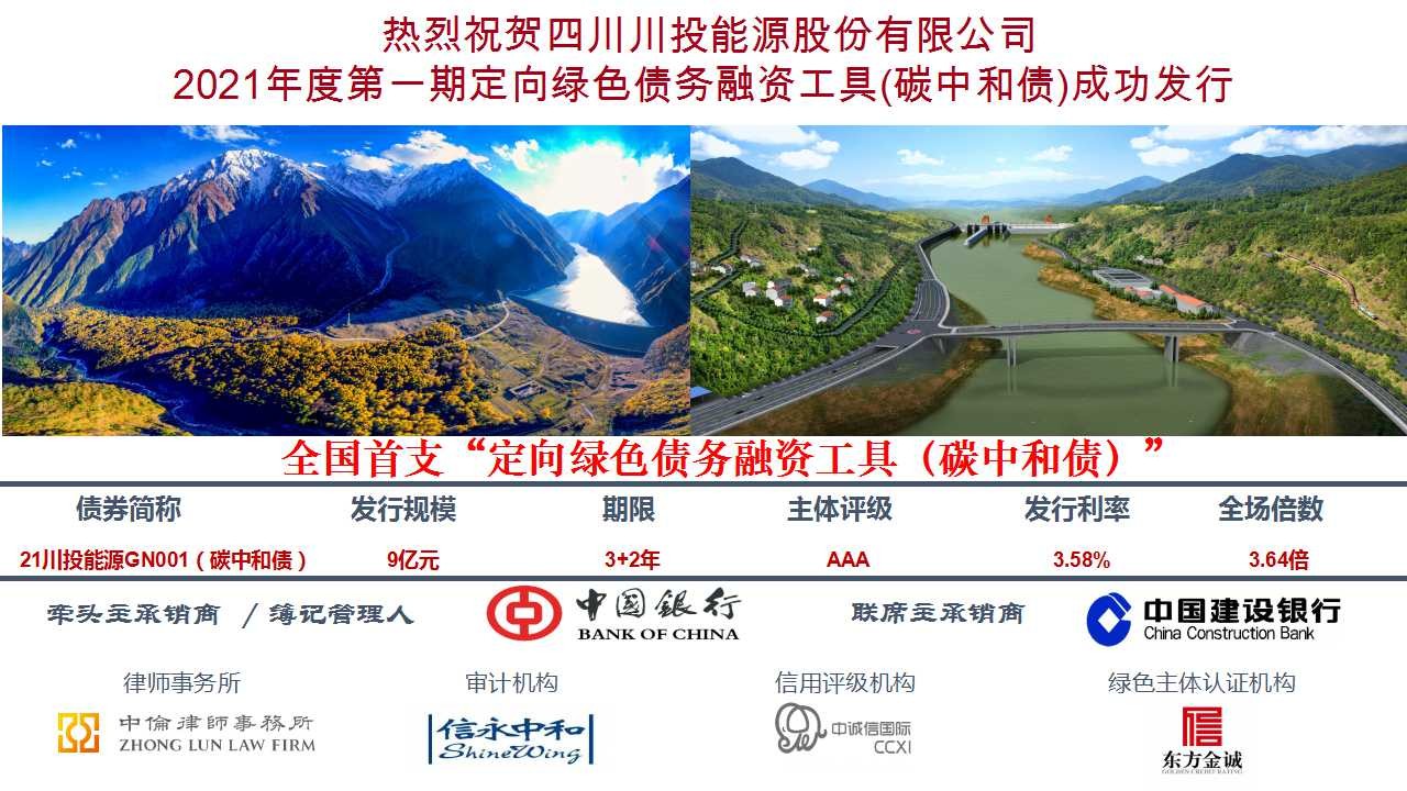 2021年7月15日,四川川投能源股份有限公司成功發(fā)行2021年度第一期定向綠色債務融資工具(碳中和債)(簡稱:21川能投GN001,代碼:q21071406.IB),本次發(fā)行金額9億元,期限3+2年,票面利率3.58%,屬目前同期限同定向債務融資工具的全國最低價格。募集資金將專項用于收購亭子口水利工程項目20%股權。