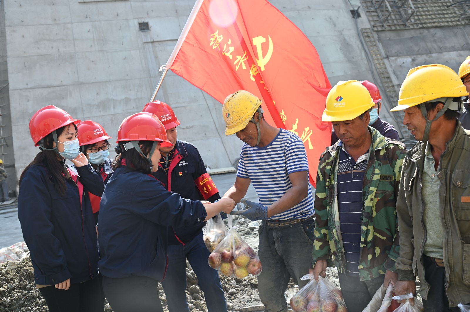 通過近日對施工班組的了解,為確保大江截流的目標按期實現,工人們中午、晚上用餐都是送到施工現場簡單解決,11月9日,機關第一黨支部組織了以“工人在加班,我為工人送加餐”的主題黨日活動,組織支部黨員、預備黨員、入黨積極分子、志愿服務者共15人到導流明渠施工現場,慰問在施工現場加班加點的一線工人,為他們送去了雞腿、蘋果等慰問品。