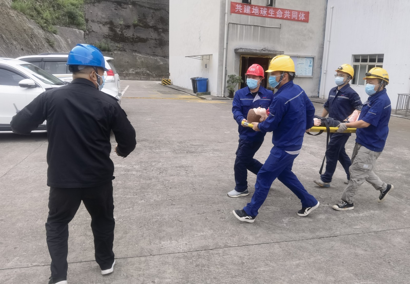 隨著總指揮一聲令下,演練正式開始。“一名員工突然暈倒,情況不明”,接到指令后,總指揮立即啟動有限空間作業現場應急處置方案,各演練小組攜帶救援設備迅速到位,穿戴變壓式呼吸機進入集水井將傷員救出,“傷員無外傷、無呼吸、無心跳”救援組對傷員情況作出基本判斷后立即實施心肺復蘇急救,用擔架轉移傷員至安全地帶,在119、120到達事故現場后,傷者移交120。各演練小組協同119對事故現場進行后續檢查,無次生風險。
