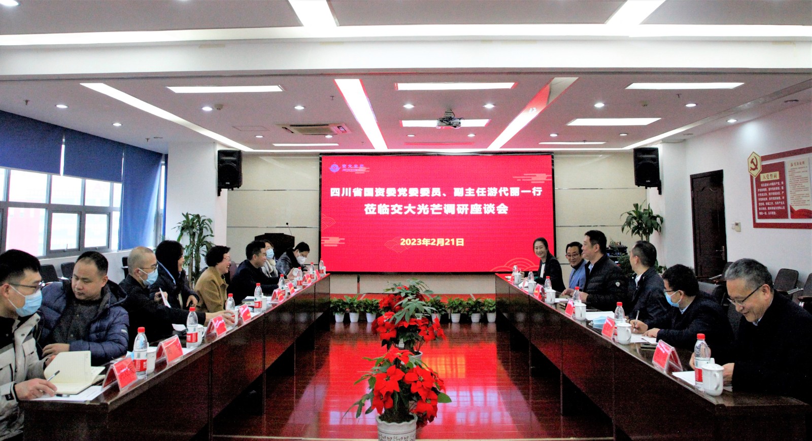 2月21日,省國資委黨委委員、副主任游代麗率隊赴交大光芒調研指導工作,省國資委巡視員符定平、財務監督與評價處、監督工作處、企業改革處一同參加調研。川投集團財務總監黃勁、資金財務部部長葉光明隨同調研。交大光芒黨總支書記、總經理劉成輝以及經營班子成員、黨總支委員參加調研座談會。