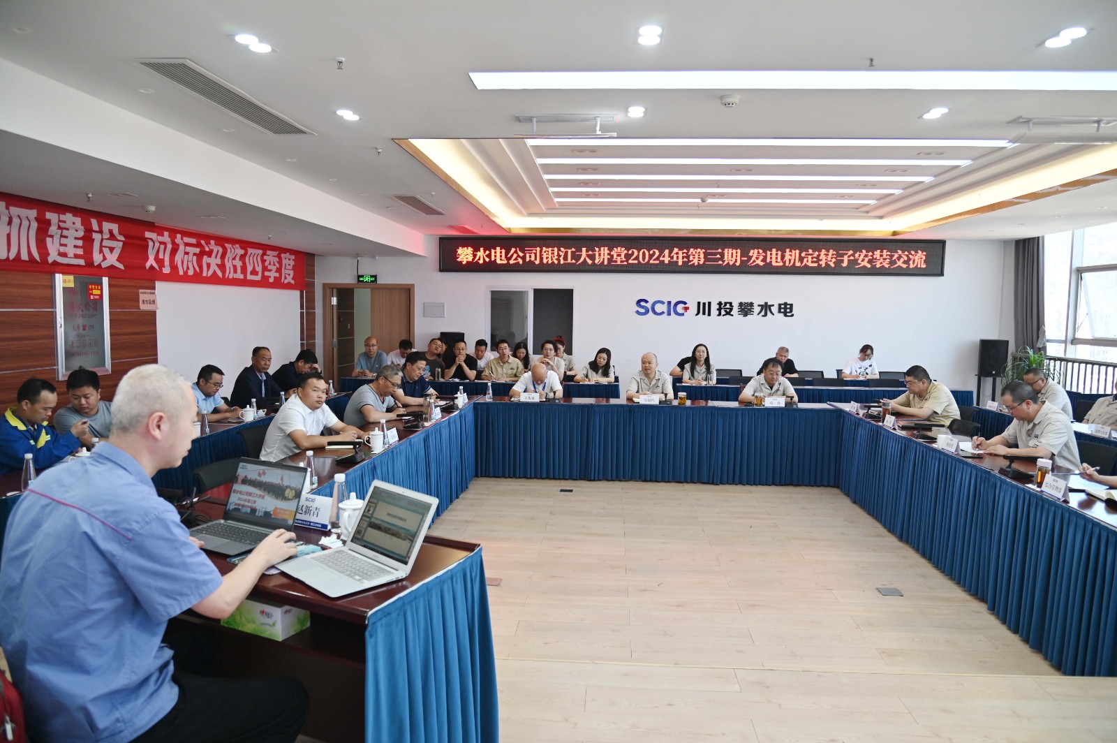 在銀江水電站主廠房橋機順利安裝完成,即將進行水輪發(fā)電機組定轉子組裝之際,攀水電公司邀請哈爾濱電機廠有限責任公司高級工程師趙新青,在銀江大講堂上給公司各部門及各參建單位,作了題為《發(fā)電機定轉子安裝》的技術交流課,公司領導、各部門及各參建單位相關人員共30余人參加培訓。