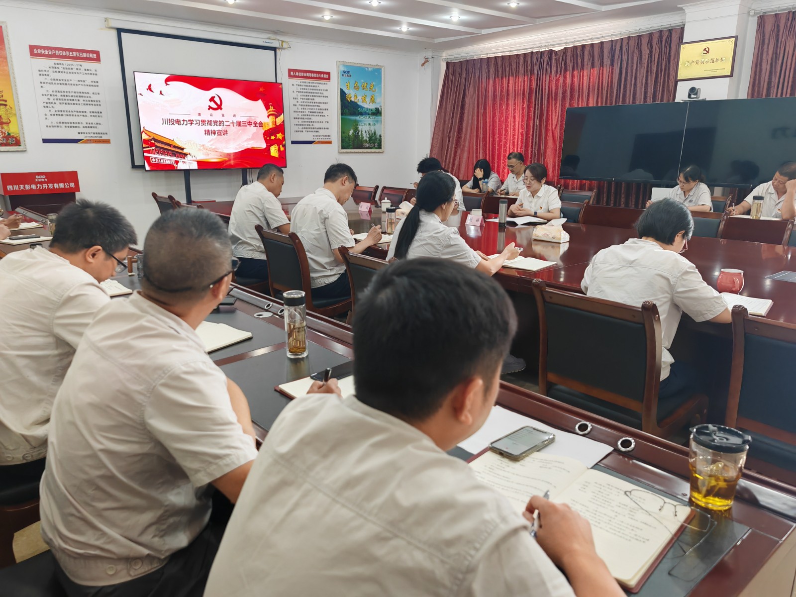近日,川投電力黨委委員、紀委書記謝麗到天彭電力宣講黨的二十屆三中全會精神,引導(dǎo)廣大黨員干部進一步把思想和行動統(tǒng)一到黨中央決策部署上來,激發(fā)干事創(chuàng)業(yè)活力。天彭電力領(lǐng)導(dǎo)班子成員、黨員、干部、關(guān)鍵崗位人員參加宣講會。