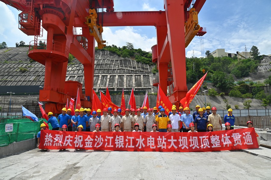 銀江水電站壩段工程結構復雜且布局有序,從左至右依次分布著左岸公路壩段、魚道壩段、安裝場壩段、機組壩段、河床溢流壩段、縱向圍堰壩段、右岸溢流壩段和右岸非溢流壩段,壩頂全長386.75米,最大壩高73米,壩頂高程1008米。大壩的建設歷時2年零8個月,2022年11月5日主體工程首倉混凝土開工澆筑,于2025年5月31日澆筑到頂,累計完成混凝土澆筑總量87萬立方米。在工程施工過程中,所屬攀水電公司與各參建單位一道,克服重重困難,構建起強有力的技術、管理、資源保障體系,推動工程建設各個關鍵節點目標均較計劃提前完成。