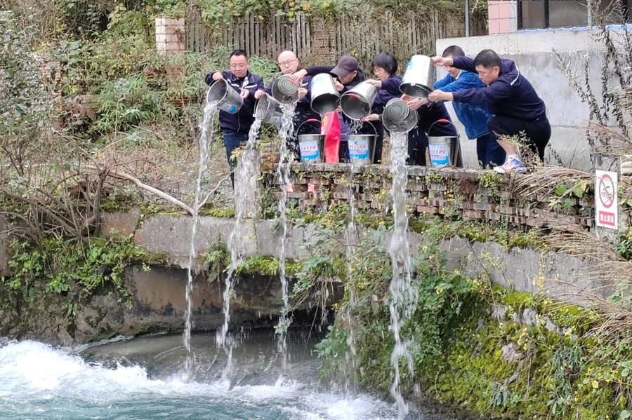 11月14日,在屬地政府、主管部門及當地群眾共同見證下,10000尾重口裂腹魚苗,從鳳鳴湖大壩上游匯入了清澈見底的沙金河。